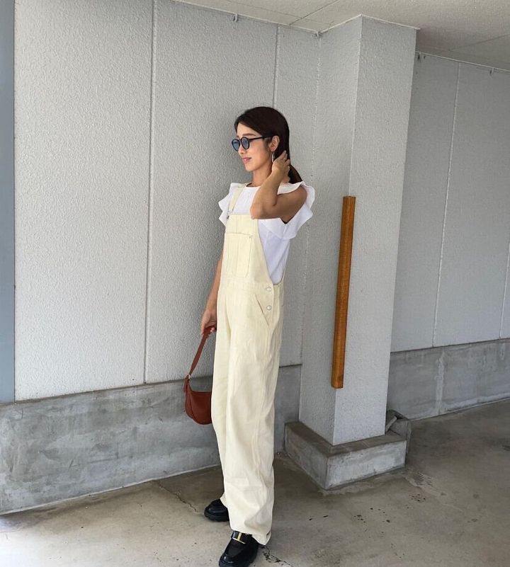組み合わせによっては子どもっぽくなってしまうオーバーオールも、同色の「ラッフルスリーブT」を合わせたワントーンコーディネートにすることで落ち着いた大人っぽい印象を与えることができます。