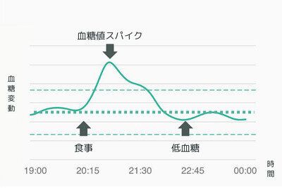 グラフを見ると、20時ごろに食事を摂ったのち急上昇した血糖値が、22時半ごろに食事前よりも低下していることがわかります。