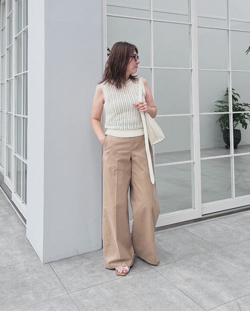 ハイウエスト・ハリのある生地感の「ワイドチノパンツ」はストンとまっすぐ落ちるシルエットで脚長効果を期待できます。さらにセンターラインが縦長のシルエットをより強調し、背を高く見せてくれるので低身長さんにピッタリ。バランスよく見せるならトップスは短めがマスト。おなかまわり・お尻まわりが気になる人は、ふんわりとした短めのトップスを合わせればOK。