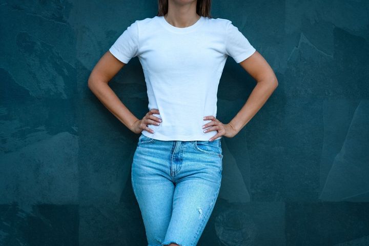 NG1つ目は、「ロゴTシャツに細身デニム」を合わせたコーデ。無地のシンプルなTシャツに比べて、ロゴが入ったTシャツは程よくポイントになると大変人気です。ところが、ボトムに細身のデニムを合わせてしまっていたら要注意。40代にはカジュアルすぎてしまいます。