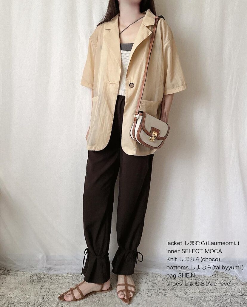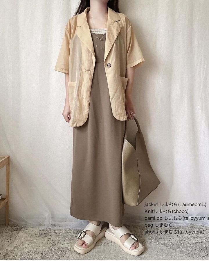 まだまだ暑いけれどちょっぴり秋を意識したコーディネートも楽しみたい……そんな時もベージュの「omi*シアーテーラーJK」は大活躍。秋を連想させるブラウンやベージュのコーディネートと相性が抜群なだけでなく、暑苦しくなく夏を連想させる露出感をカバーしてくれます。