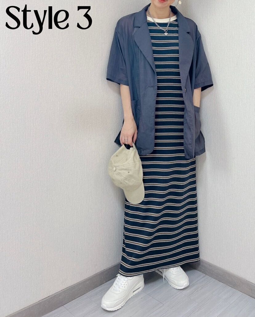 ラフな印象の動きやすいワンピースに「omi*シアーテーラーJK」をあわせれば、きちんと感がプラスされお出かけ着に格上げ。ワンランク上のカジュアルスタイルが完成します。