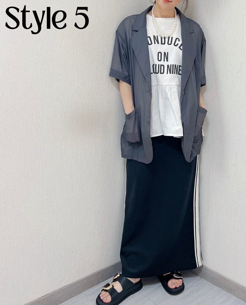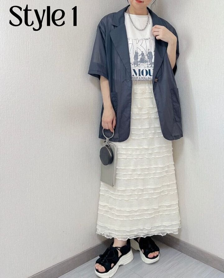 「omi*シアーテーラーJK」(1,969円)は、カジュアルなコーディネートにもきれいめのコーディネートにも着まわすことができる万能アイテム。ワンカラーのコーディネートにグレーの「omi*シアーテーラーJK」をあわせることでコーディネートにメリハリをプラス。シアー素材なのでジャケットでも涼しげ!