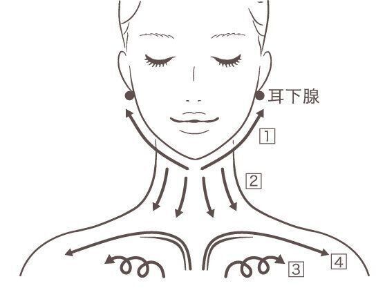 1、あご先からフェイスラインまで引き上げ、耳下腺を軽くプッシュ。