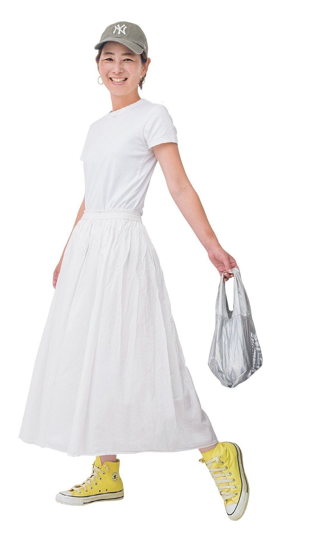 子ども5人の母ちゃんとして毎日バタバタの涼子さんの制服は「白の上下」。「毎朝おべんとうも作っていて、朝5時半起きでも時間が足りない。私の服は上も下も白に固定しちゃえば朝、組み合わせに悩まなくて済むと気付き、ここ5年くらい白コーデで生きてます。白は漂白できるからシミは気にならないし、白がレフ板みたいになって顔色が明るく元気に見えるのも40代の私には最高です」。