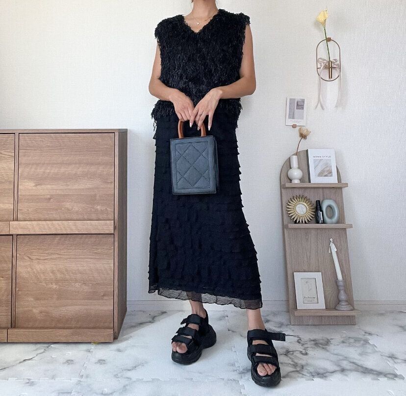 ブラックワンカラーのコーディネートも、シャギーベストを取り入れることで素材感の違うアイテムを使ったワンランク上の印象を与えるワンカラーコーディネートが完成します。スタイリッシュでおしゃれな印象を与えてくれるのはトレンドのシャギーベストだからこそ。