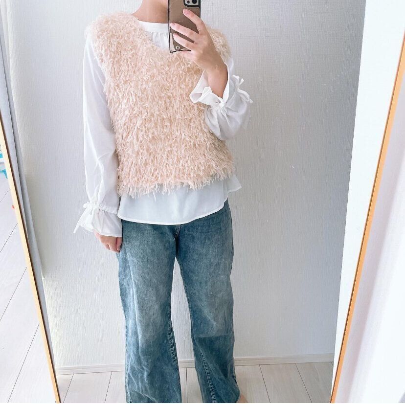 しまむらのシャギーベストでいちばん人気なのが「TNKシャギーベスト」(1,089円)。長すぎず短すぎずの絶妙な丈感なので、さまざまなアイテムとの組みあわせを楽しめるベストです。