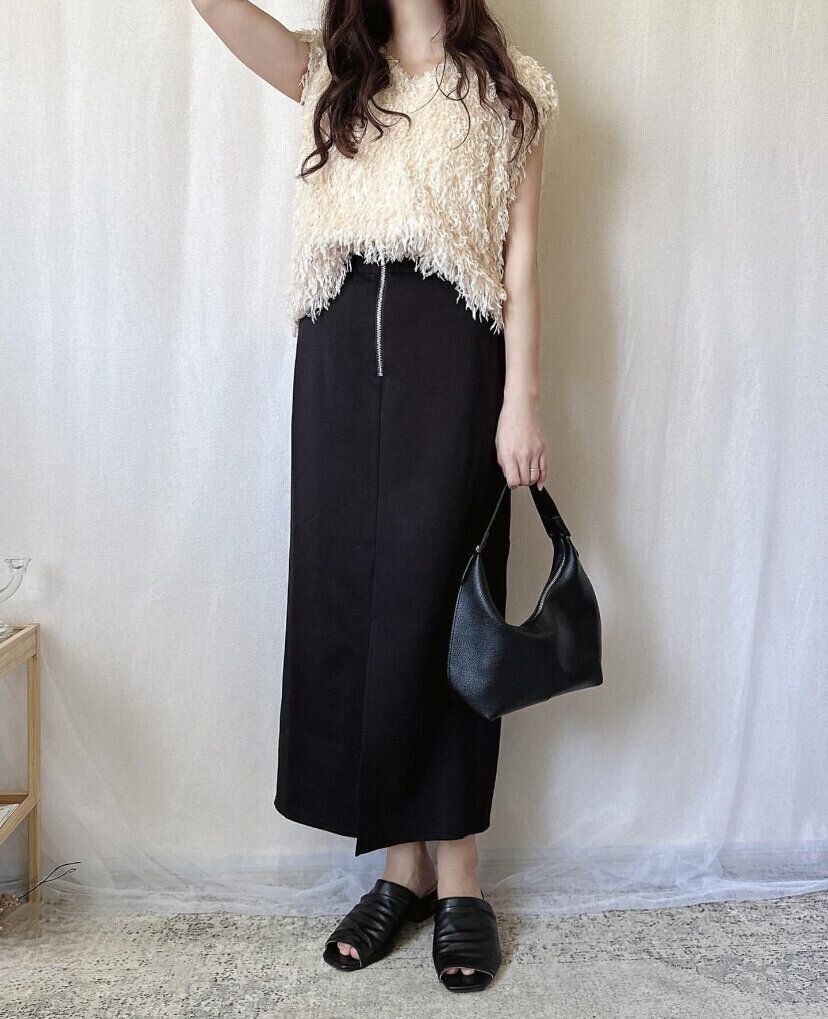 ボリュームやデザイン性でパッと目をひくシャギーベストにタイトスカートを組みあわせれば、メリハリのあるコーディネートが完成!目線が上に行きシュッとした印象を与えてくれるので低身長さんにもおすすめのコーディネートです。