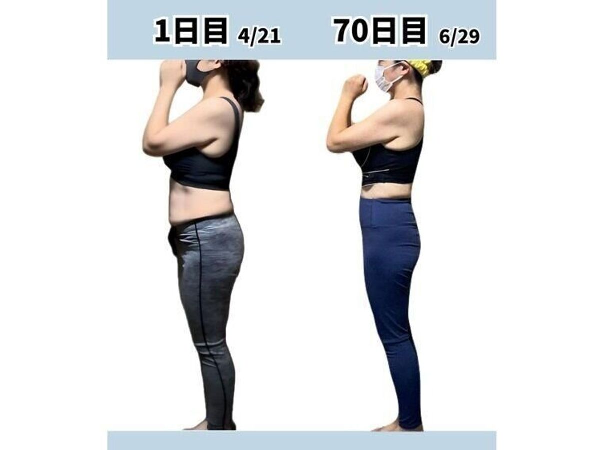 こちらが、70日間のダイエットでのビフォーアフターの写真。体が明らかに薄くなっています!とくに下半身が驚くほどスッキリ。仕事、家事、育児と、いそがしい毎日。でも、食生活に気をつけ、家でのトレーニングをコツコツと続けたことが、ここまでの大きな変化につながりました。