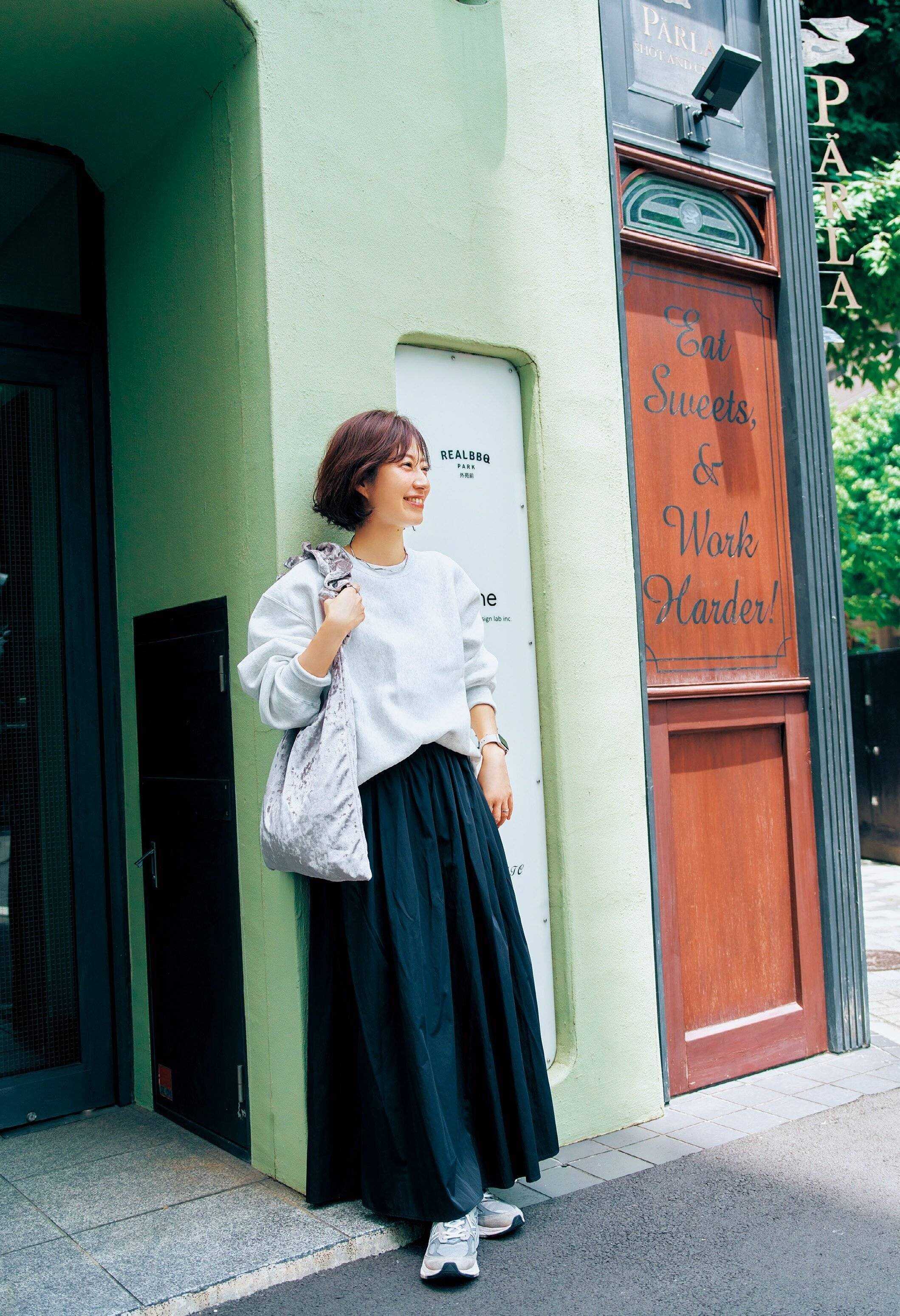 こちらのスウェットはもう何年も愛用中。形も色も、ガンガン洗ってもへたらない丈夫さも気に入っています。中途半端に大きなサイズより、思い切ったオーバーサイズのほうが、パンツにもスカートにもバランス良く合わせやすいです。