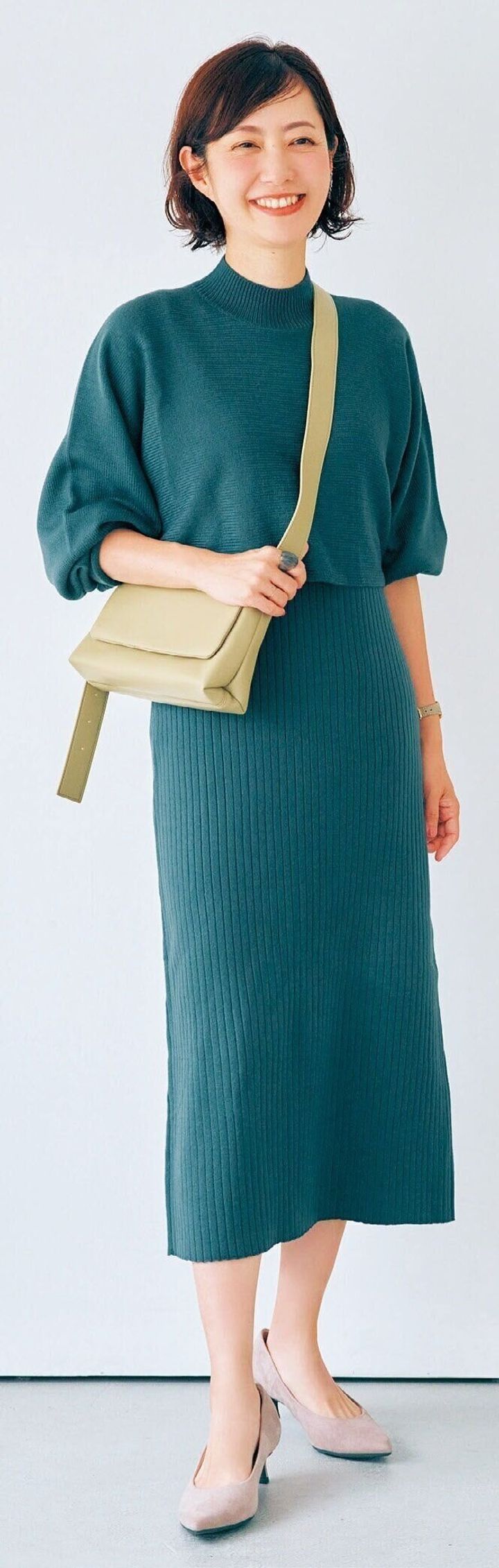 ドルマンスリーブのセーターとジャンパードレスのセット。それぞれ単品使いも可能。「2ピースセットワンピース」(ダークグリーン、ブラック、ブラウン・全3色)/GU