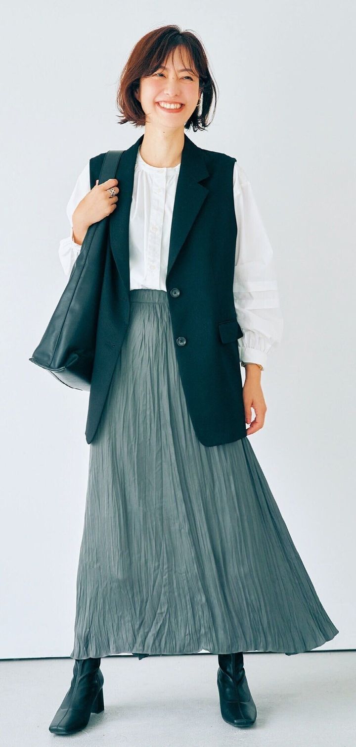 Tシャツやカットソー、ブラウスなどの上に羽織るだけでコーデを引き締めてくれる万能なベスト。1枚は欲しい!