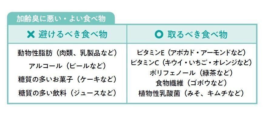 新鮮な野菜や果物、緑茶は活性酸素の発生を抑える栄養素や酵素がたっぷりなので積極的に取って。乳酸菌が豊富な食品で腸内環境を整えるのも有効です。肉類は加齢臭の元となる皮脂が増えるので控えめに。