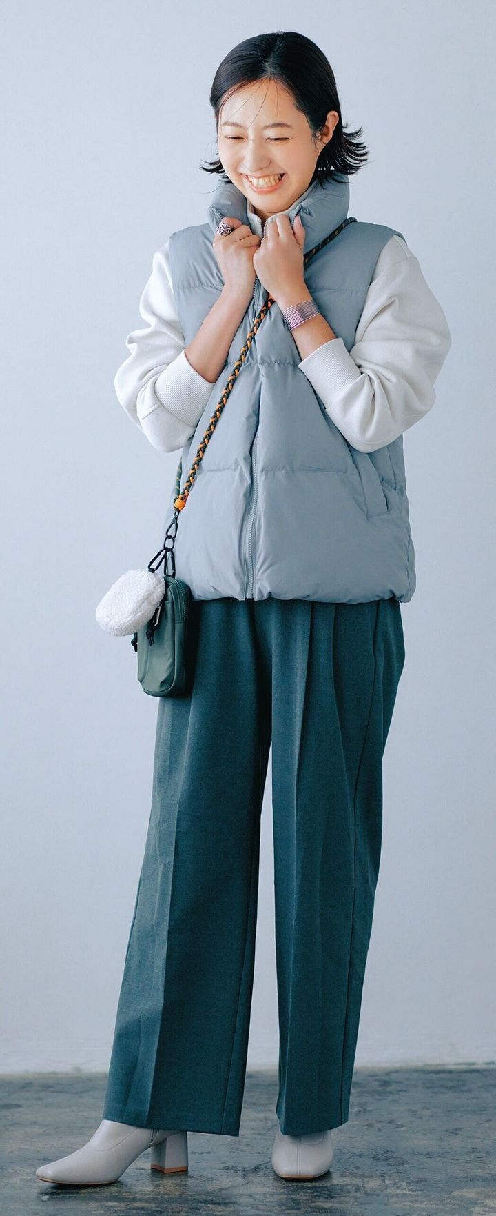 コートを着るほどではないけれど、スウェットだけじゃ寒いときにベストが大活躍。グレーはキレイめにもまとまる万能色。