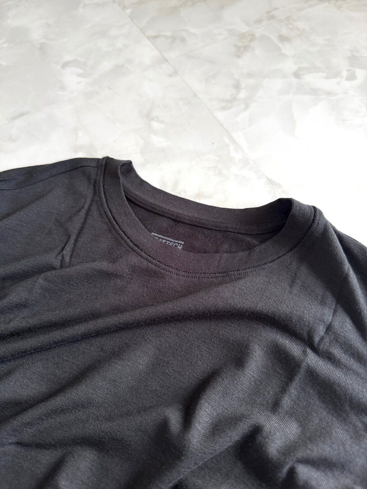生地の厚さはTシャツよりも薄い生地になっています。冬の重ね着はモゴモゴとして動きにくくなったり、着ぶくれの原因になりますよね。