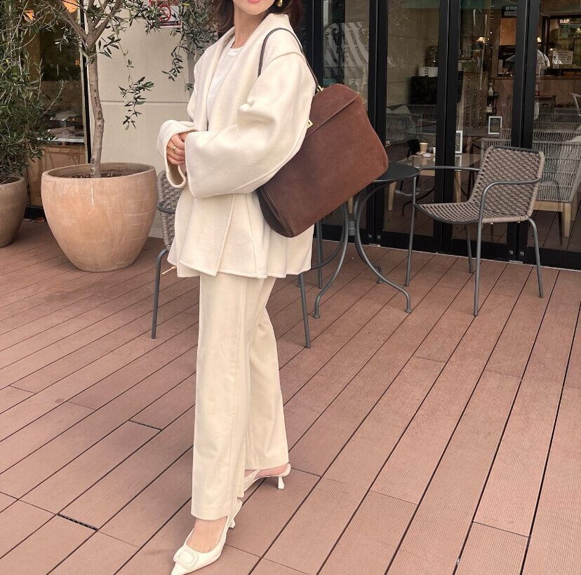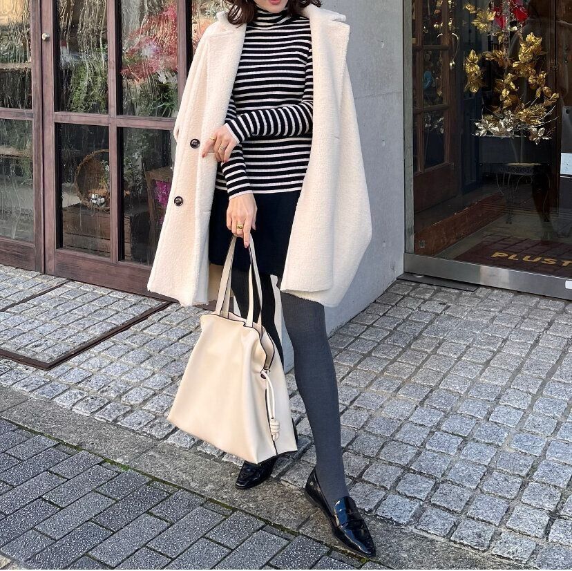 洗練された上品さを感じる大人モノトーンコーディネートですが、実はニット・スコート・タイツはユニクロ!お洋服だけでなく、小物も優秀なユニクロ。これからの季節大活躍するタイツも、ユニクロなら全世界で愛されているヒートテックなので寒さ対策にもピッタリ!「ヒートテックタイツ」(1,500円)「ヒートテックニットタイツ」(1,500円)「ヒートテックニットリブタイツ」(1,500円)と、バリエーションも豊富なのもうれしいポイント。