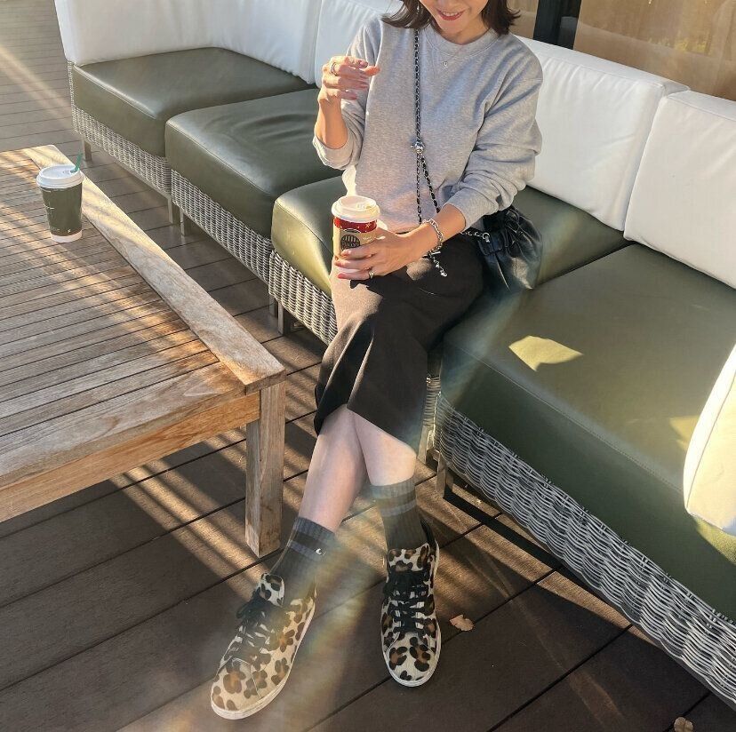 シンプルな「スウェットシャツ」(2,990円)は、忙しいときにサッと着用できるママにピッタリのアイテム。ただ、シンプルゆえに、コーディネートによっては部屋着感が強くなってしまいそう……。タイトなスカートをあわせれば、カジュアルな中にも女性らしさをプラスしたカジュアルコーディネートに。お洋服はシンプルにまとめつつ、スニーカーにトレンドのレオパード柄を取り入れるテクニックは、ぜひマネしたい!