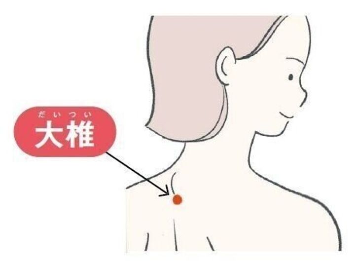 肩甲骨の上部の間。首の付け根で出っ張っている骨のすぐ下のくぼみから背骨2つ分下がり、左右の外側に指2本分のところ。温めることで体全体の血流が良くなり、風邪の予防に効果があります。