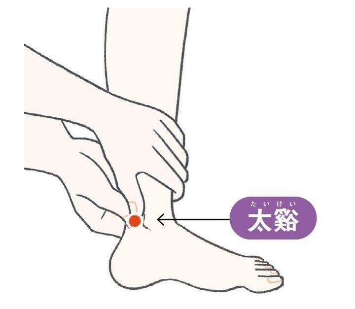 内くるぶしとアキレス腱の間のくぼみ部分。ここをほぐすと、下半身の血行が良くなり、全身の冷えの改善につながります。また、腎臓の機能を高める効果があるため、水分代謝を良くし、むくみ改善も期待できます。