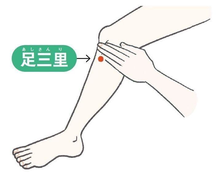 膝の皿の外側のくぼみから、指4本分下。両手の親指をあてて押すと、刺激が入りやすくなります。胃腸などの消化器系の不調を整える働きがあるとされていて、内臓を温める効果もあります。