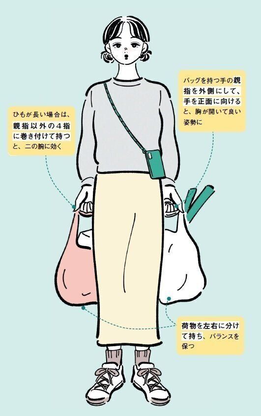 大きいバッグを片手で持つと、体のバランスが崩れやすいので避けて。荷物が多いときは、バッグを2個持ちして分散させましょう。手のひらの向きを意識すれば、腕や大胸筋が刺激され、バストアップ効果も期待できます。