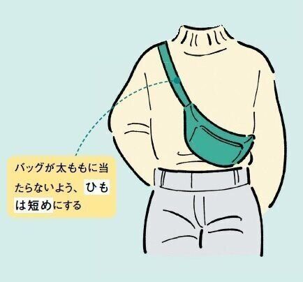 ●バッグが太ももに当たらないよう、ひもは短めにする