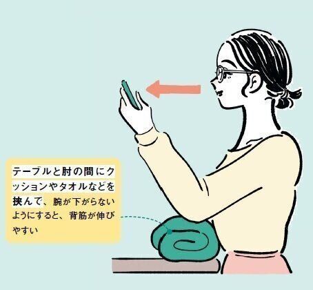 うつむいた姿勢でスマホ画面を見続けていると、首や肩の凝り、二重あごの原因に。肘の下にクッションなどを挟んで腕が下がらないようにスマホを持ち、目線を上げましょう。背筋も伸びて、下腹が出にくくなります。