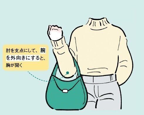 腕を内向きにしてバッグを掛けると、肩が丸まり、背中に肉が付きやすくなります。腕を外向きにして持つと、胸が開き、見た目も美しく!バッグを持つ手を時々入れ替えてバランスを取りましょう。