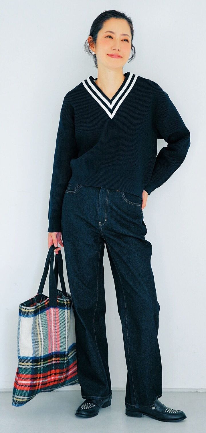 濃いネイビーのきれいめジーンズでカジュアルを格上げ