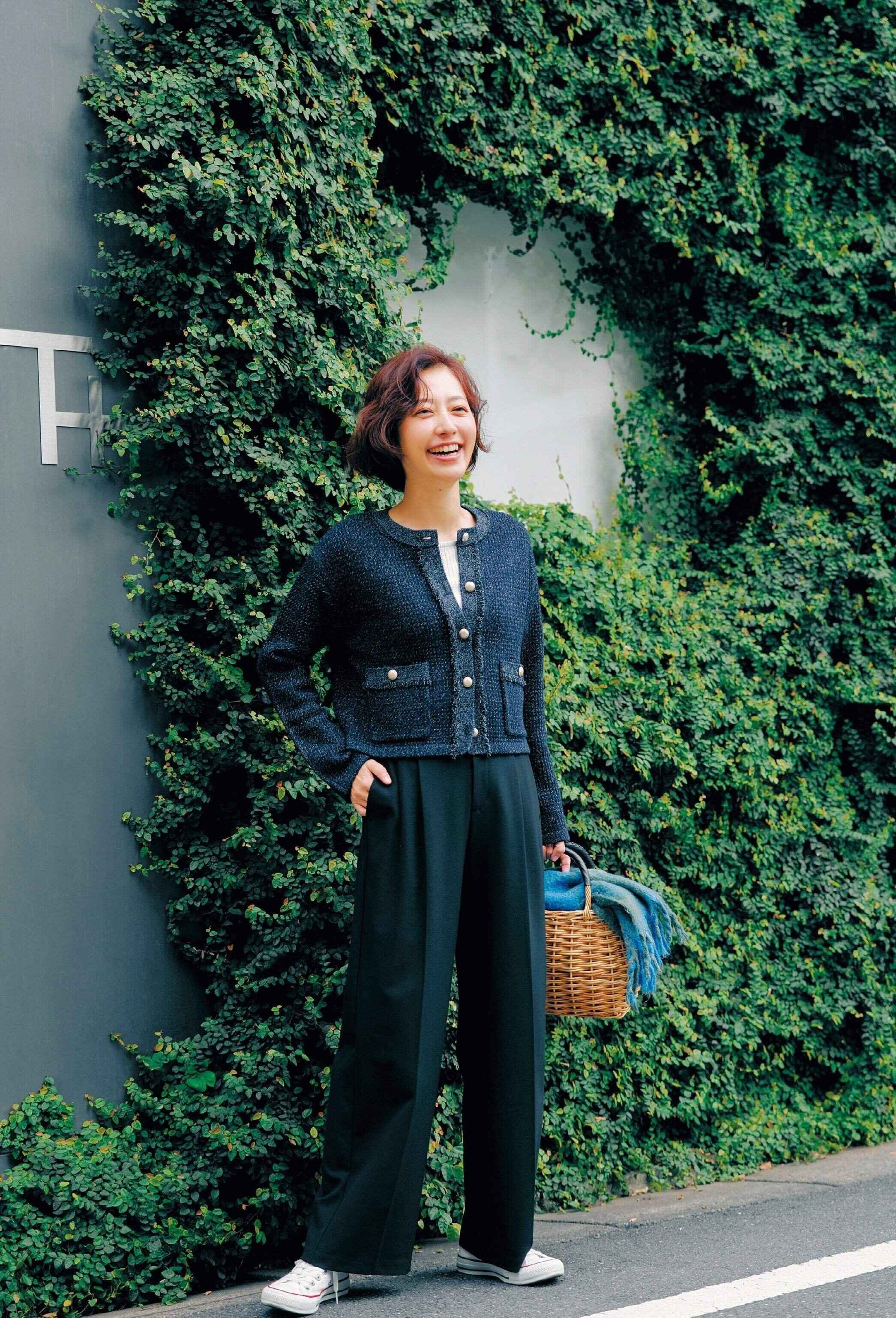 普段はカジュアル派の人にもぜひ試してほしいのがこちらのニットジャケット。カーディガンのようにラクな着心地なのに、見た目は高級感のあるジャケットで、パンツにもスカートにもマッチ。オケージョンにも使えるお助けトップスです。