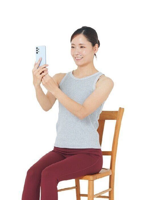 顔が前に出た状態でスマホをのぞき込むと、顔出し型の猫背になるリスクが。顔が前に出ないように、スマホを高めの位置にキープして。