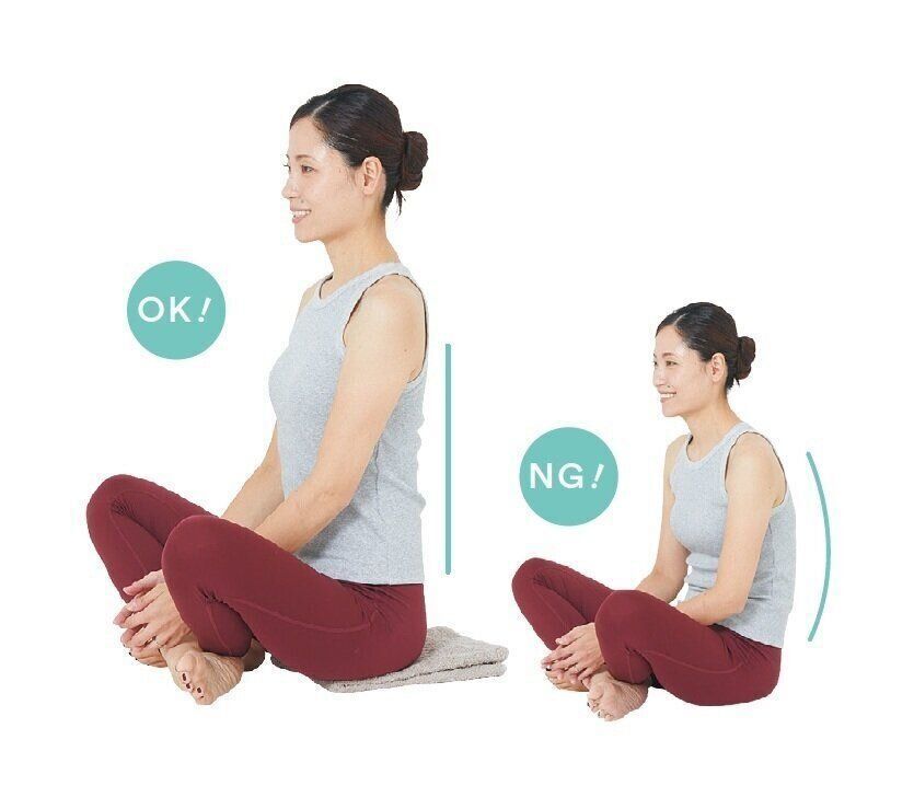 床座りはいすに座っているときより悪い姿勢になりがち。お尻の下に畳んだタオルやクッションを挟んで、骨盤を立てるように意識。