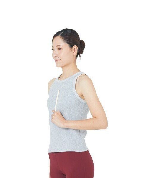 割りばしやペンを胸の中央に縦に置き、片手で押さえる。