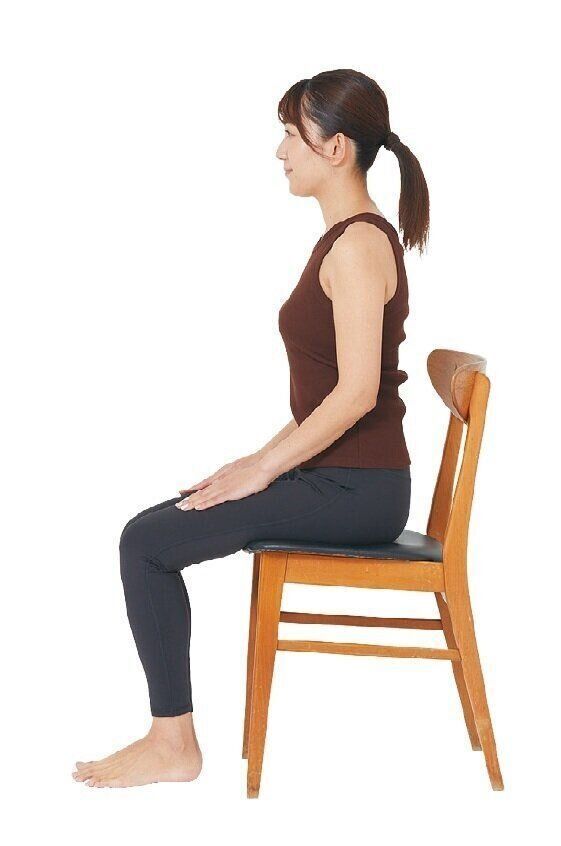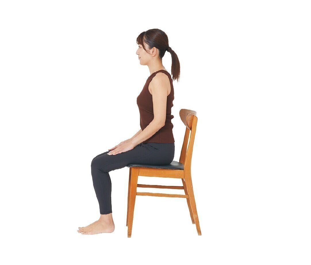 お尻の穴が真っすぐ下を向いていることを意識して座ります。座面の高さがひざ下の長さと同じくらいのいすを使うようにしましょう。