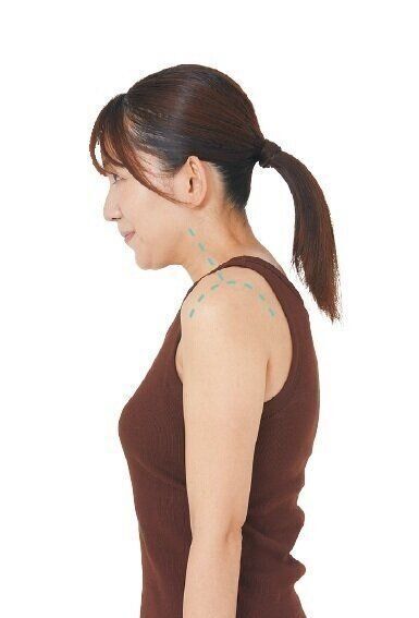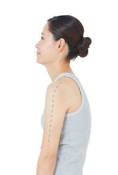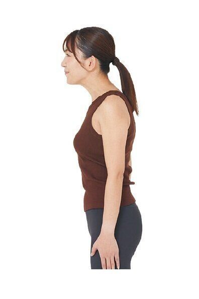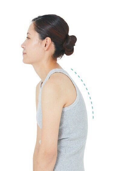 横から見たときに肩が前に出ているタイプ。肩の可動域を広げるストレッチを実践して。