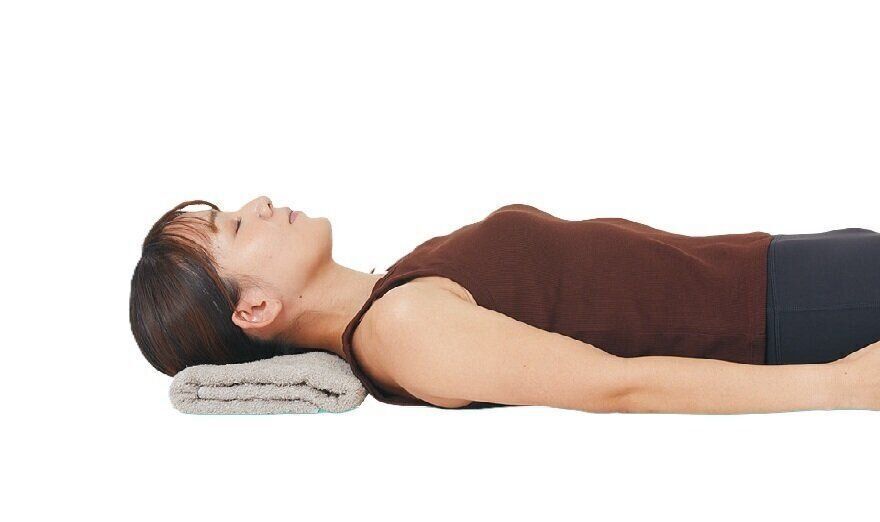 あごが上がったり下がったりしないように、顔が床と水平になる高さをキープ。枕は顔が水平になる高さや柔らかさの物をチョイス。