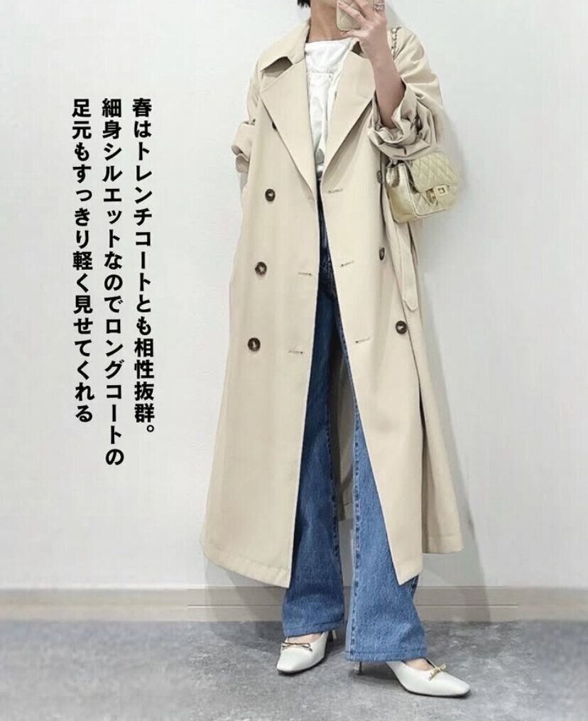 「ストレートジーンズ」は、程よいゆとりがありつつもルーズ過ぎないストレートシルエットなので春の定番アイテムロング丈のトレンチコートをあわせても足元がすっきりしてバランスのよいコーディネートに仕上がります。Iラインが強調され、実際よりも身長が盛れるデニムアイテムなので低身長さんにもおすすめ。