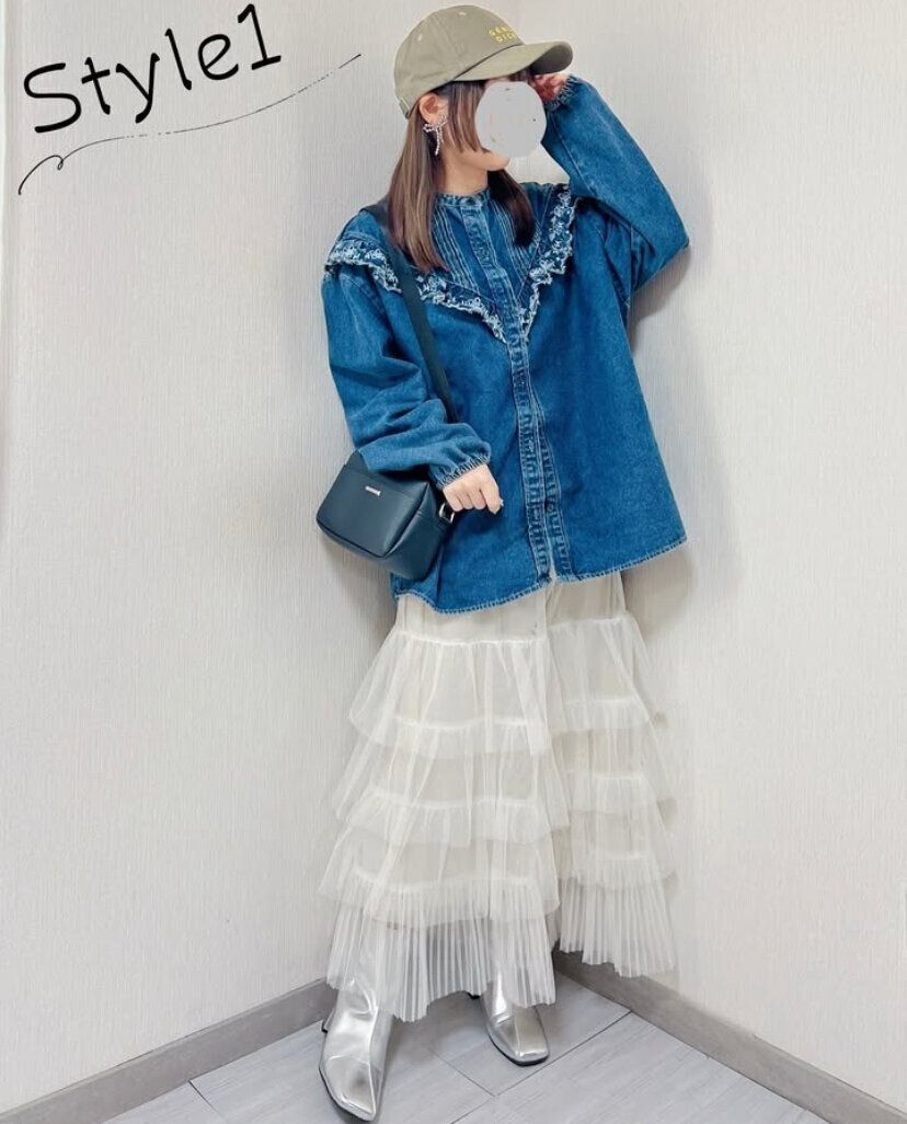 ガーリーなアイテムにしまむらで人気のフリルデニムシャツのひとつ「TAI*デニムシシュウフリル」(1,969円)をあわせることで、ふつうのフリルシャツよりもカジュアル要素がプラスされておしゃれな甘辛コーディネートが完成します。