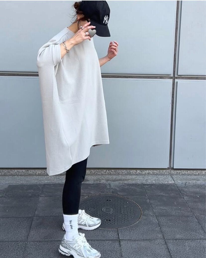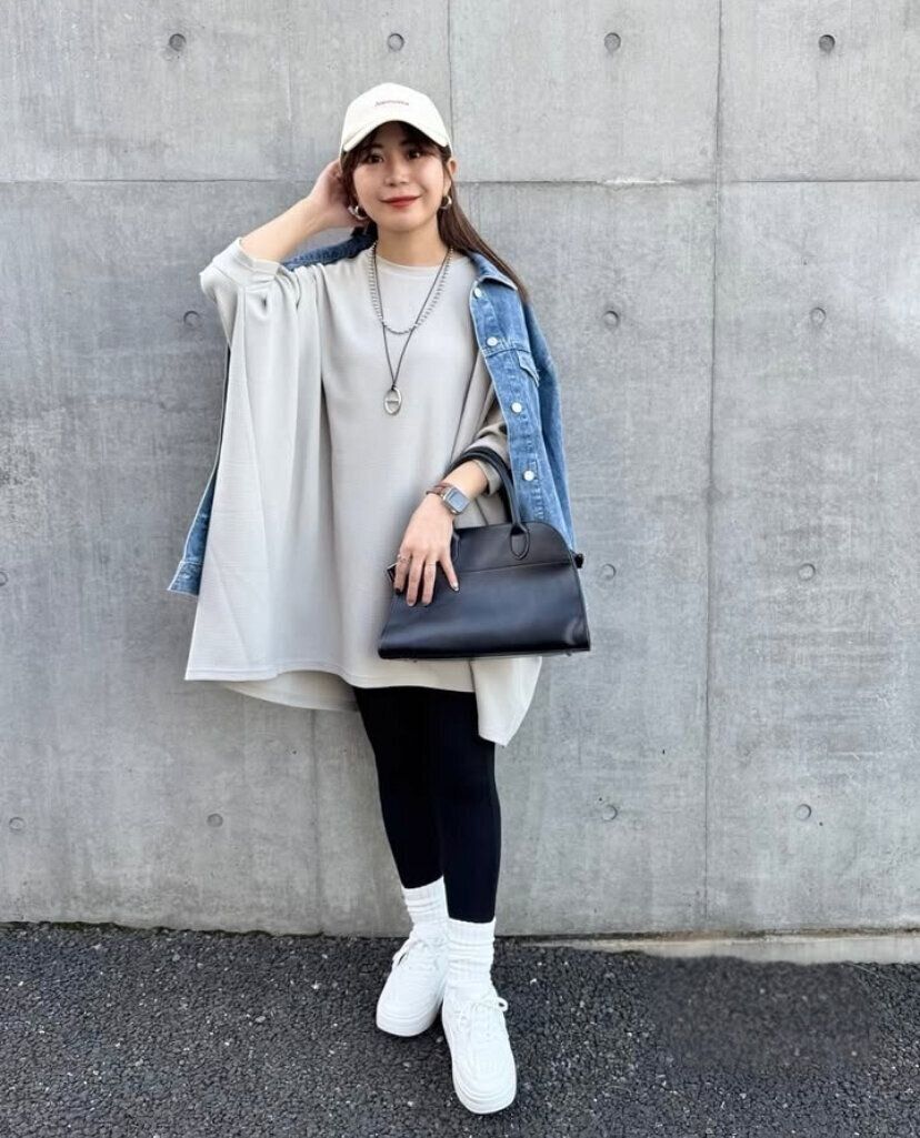 ビッグサイズシルエットのトップスにレギンス×ソックスのスポーティカジュアルコーディネートは、動きやすくラフなスタイルなのに、海外チックでおしゃれな印象を与えてくれるコーディネート。cocaの「エンボスビッグシルエットトップス」(1,690円)は、ストレッチ性のあるしわになりにくいエンボス生地を使用しているのでアクティブに過ごす時のおしゃれにピッタリ!