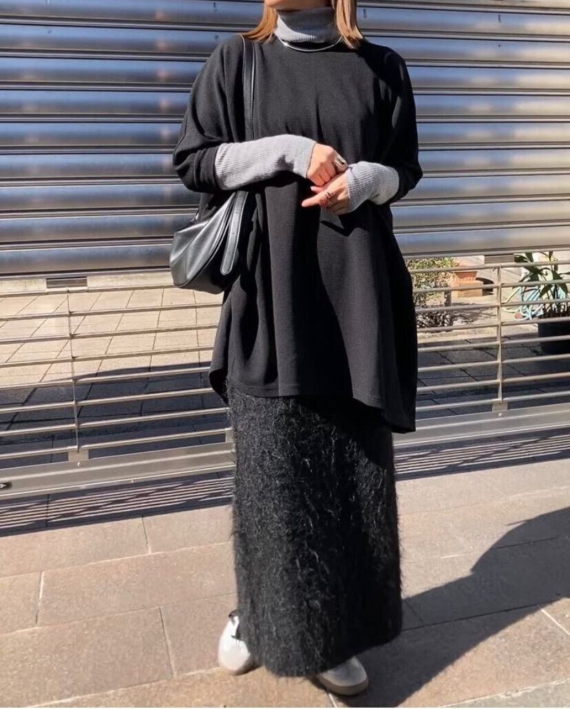 エンボスビッグシルエットトップスは、気になる人も多い腰まわり、お尻まわりまですっぽり隠れるオーバーサイズシルエットなので体型カバーにも一役買ってくれます。着やせ効果を狙っている人はタイトなボトムスをあわせたメリハリのあるコーディネートがおすすめ。ブラックのワンカラーコーディネートはとくに着やせ効果を期待できます。