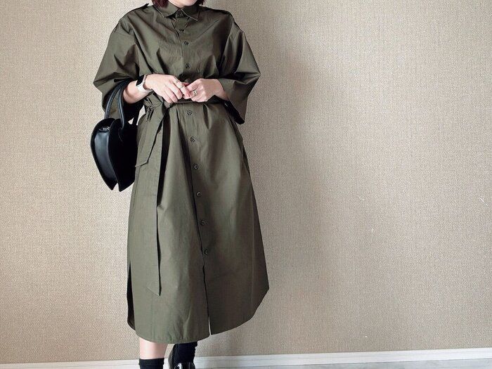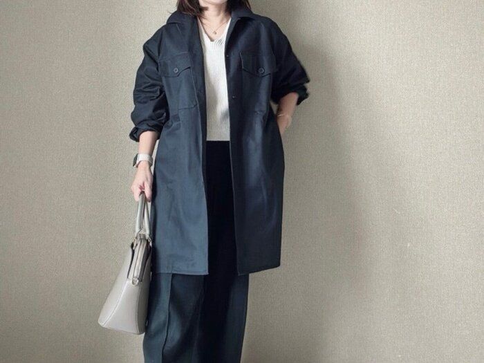ネイビー×ブラックでコーディネートするとシュッとスタイリッシュな雰囲気に。ワンカラーコーデをすると全身がのっぺりと見えてしまいそうな場合は、質感を変えるのがおすすめです。こちらはレザー調のアウターと合わせ、奥行きのある着こなしが高ポイント!