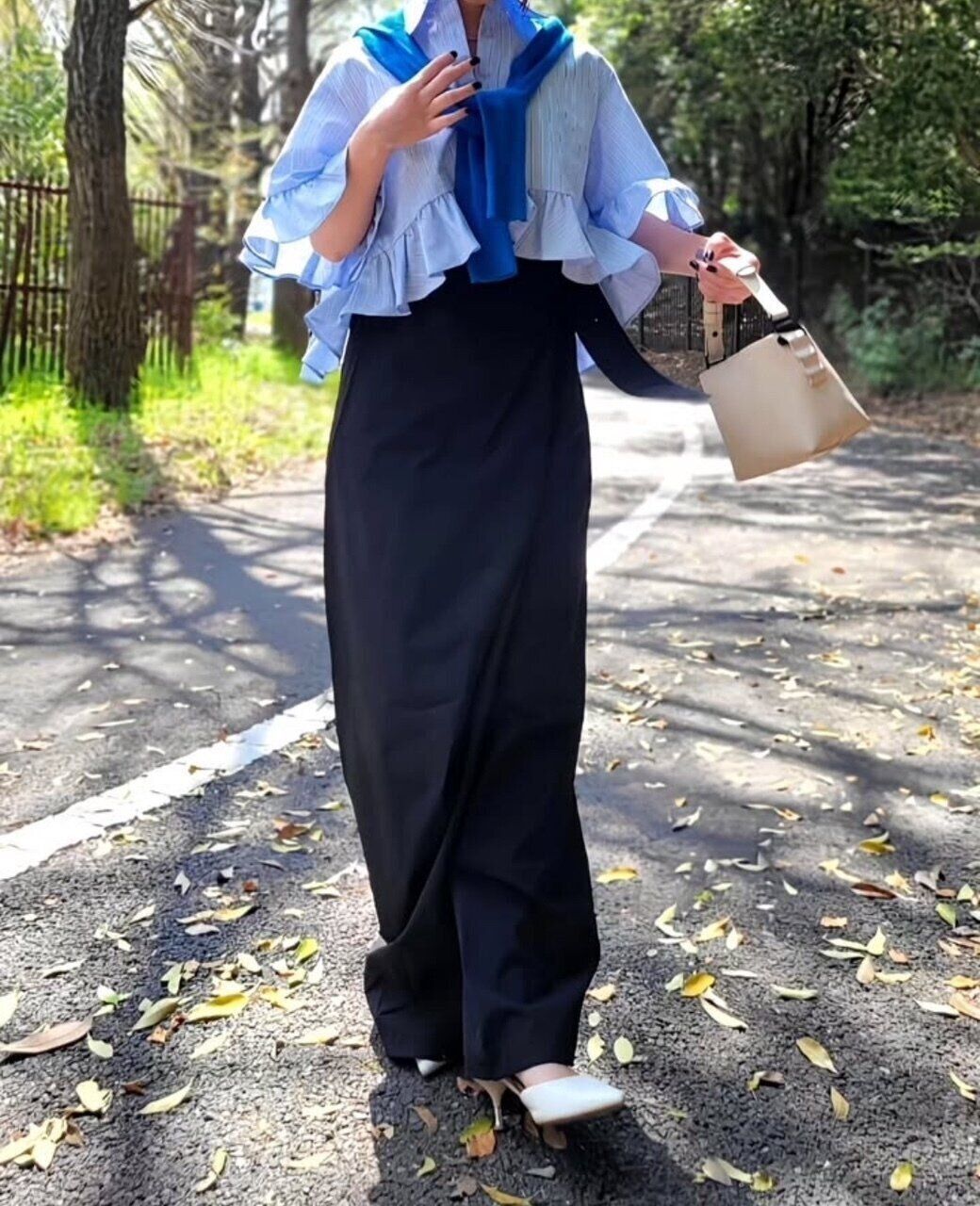 - アラフォーが着るならブルーがおすすめ「ペプラムシャツ[五分袖]」