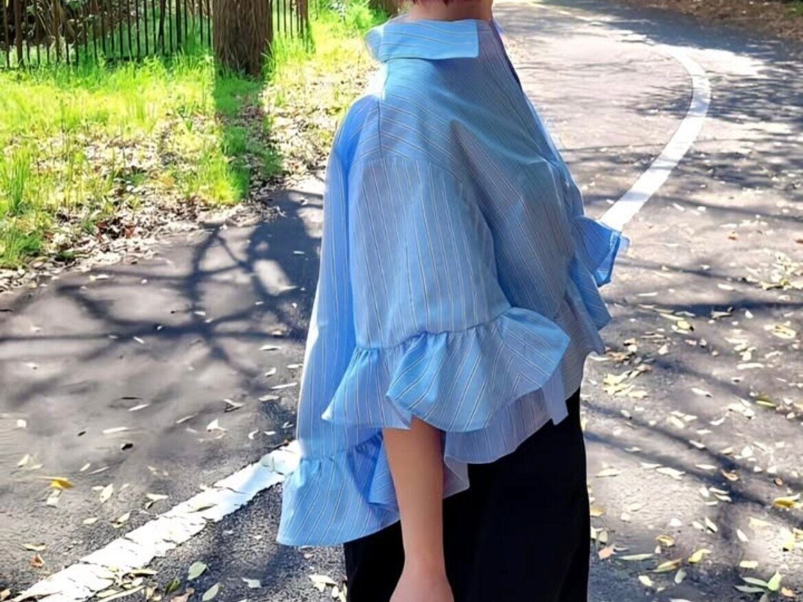 裾と袖口に施された大胆なフリルが印象的な「ペプラムシャツ」(2,990円)は、1枚着用するだけで華やかさがアップするデザイン性の高いアイテム。やや短めな丈感やガーリーなデザインが魅力的なアイテムですが、若い子向きかも…という印象も。着こなしやすさを重視するならホワイトよりもブルーがおすすめ。