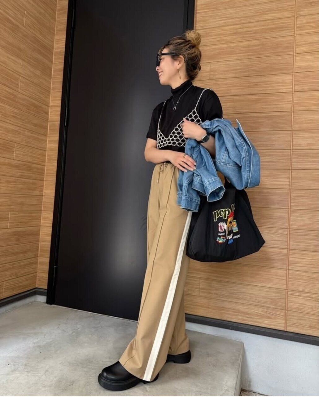 色違いのベージュは同じデザインでも雰囲気ががらりと変わるので、2色買いするおしゃれさんも多数!パンツはユニセックスなので男女問わず履けるデザイン。少しボーイッシュな印象の強いアイテムにビスチェをプラスすることでレディライクな要素をプラスした着こなしは2025年春夏の要チェックテクニック!ぜひマネしたいですね。