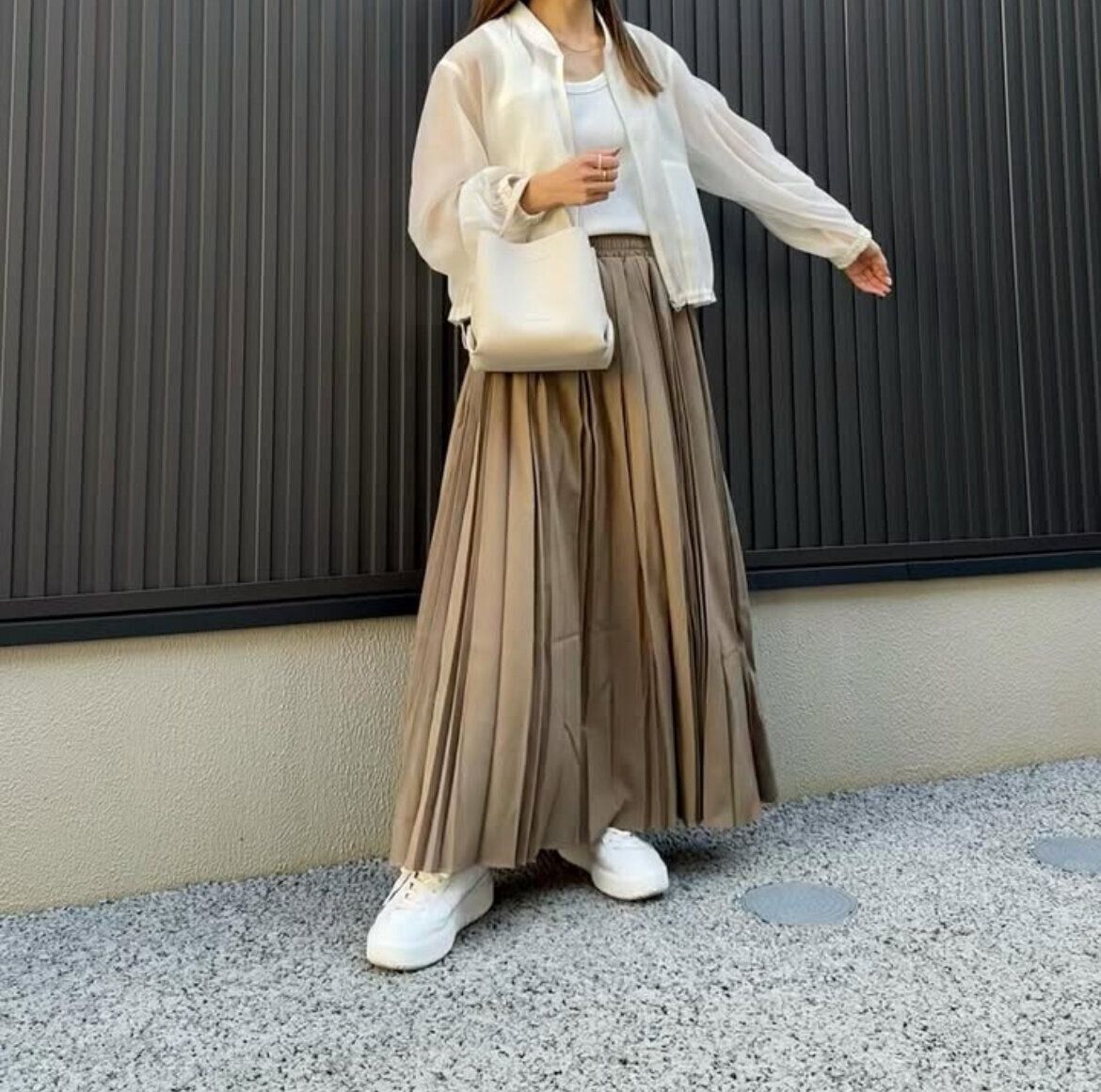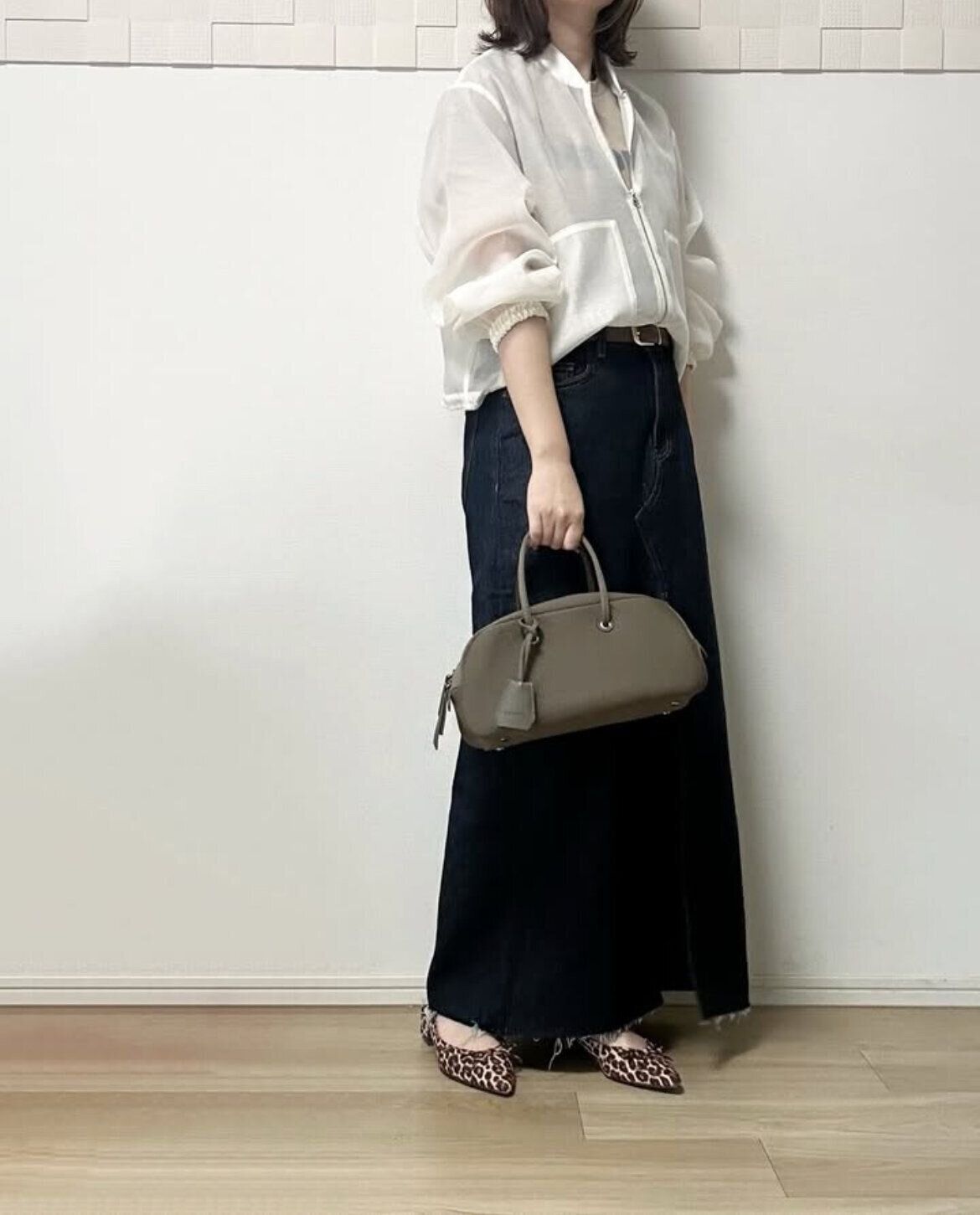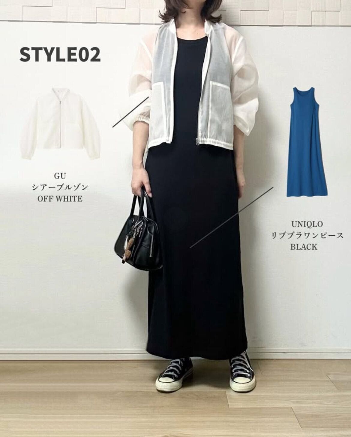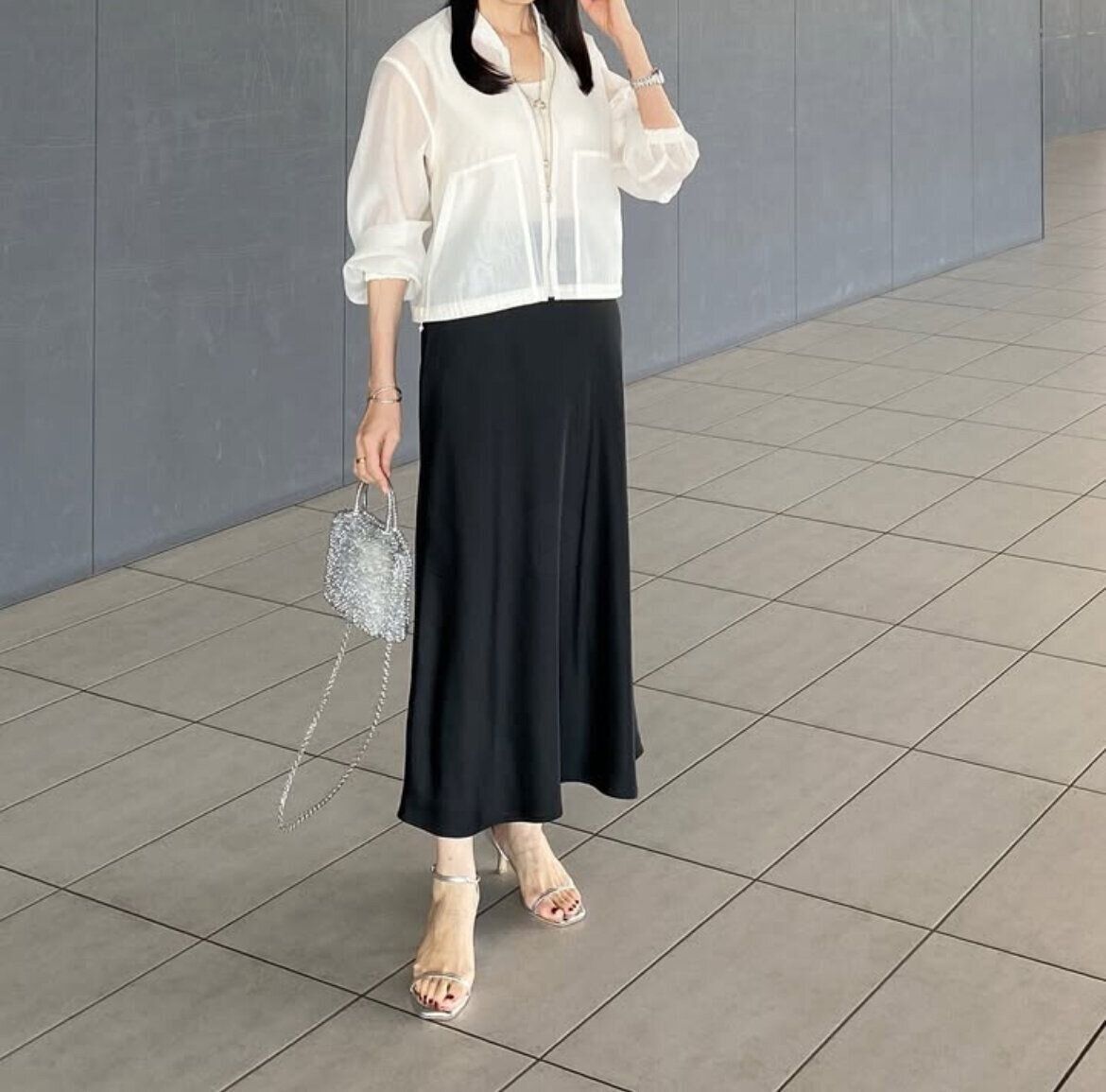 ロング丈のシンプルなワンピースに「シアーブルゾン」をプラスすればウエストマークにメリハリができてよりスタイルが良く見えちゃう!シアーブルゾンは涼しげなアウターなので、初夏でもUV対策としても着用でき、ガッツリ二の腕を出すのに抵抗がある人にもピッタリ。
