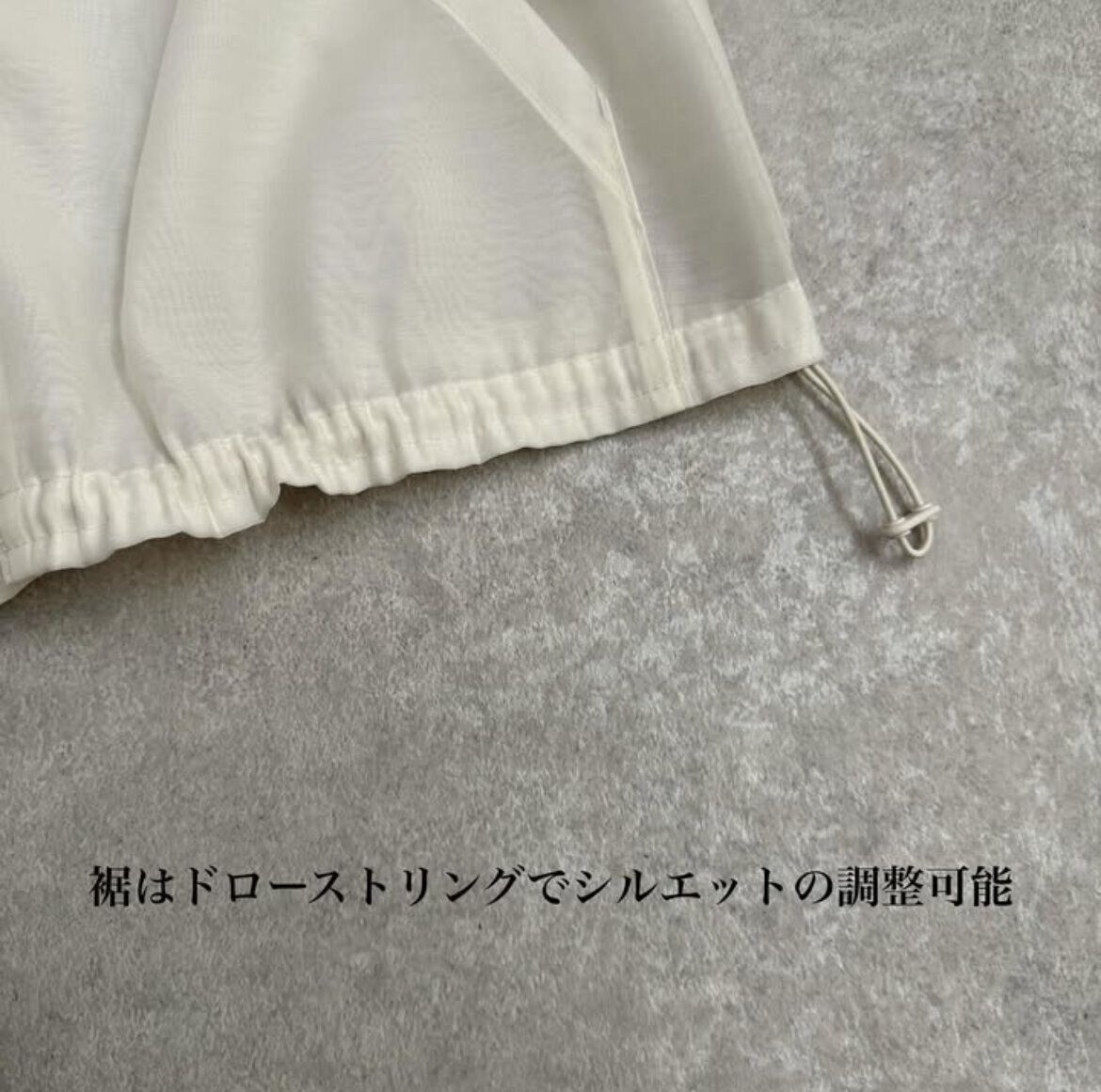 GUのシアーブルゾンは裾がドローストリングでシルエットや丈感の調節が可能なので、着用したいスタイルによってアレンジできコーディネートの幅が広がるという、うれしい特長があります。