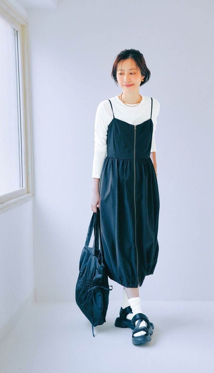 今年らしいバルーンシルエットのワンピは軽くて着心地がいい!黒を選んでシンプルなインナーと合わせるのが正解。