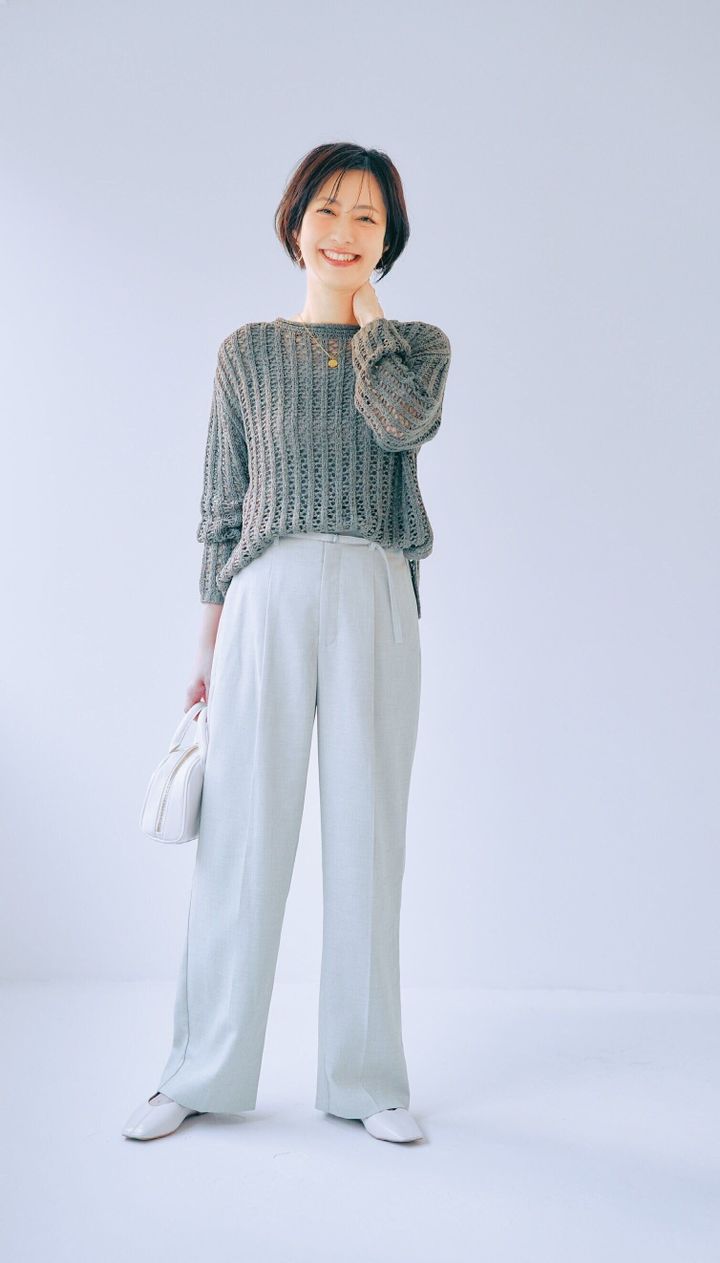 体のラインを拾わないゆったりシルエットのセーター。メッシュだからインナーを変えると表情が変わり、長く着られる。