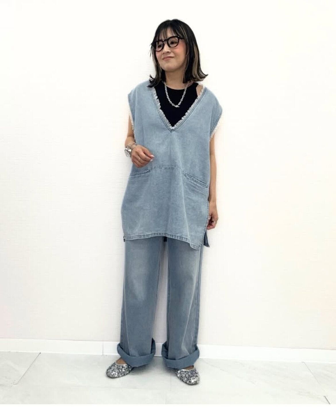 しまむらで販売されているデニムベスト「ケミカルデニムフリンジV」(1,639円)は、1枚でおしゃれも着やせも叶う注目のアイテム。オーバーサイズのデニムベストは気になる部分をカバーしてくれるだけでなく、腕や首回りをすっきり見せてくれます。フリンジが施されていることでおしゃれ度もUP。デニム×デニムのセットアップ風の着こなしでこなれ感を演出しちゃいましょう♪
