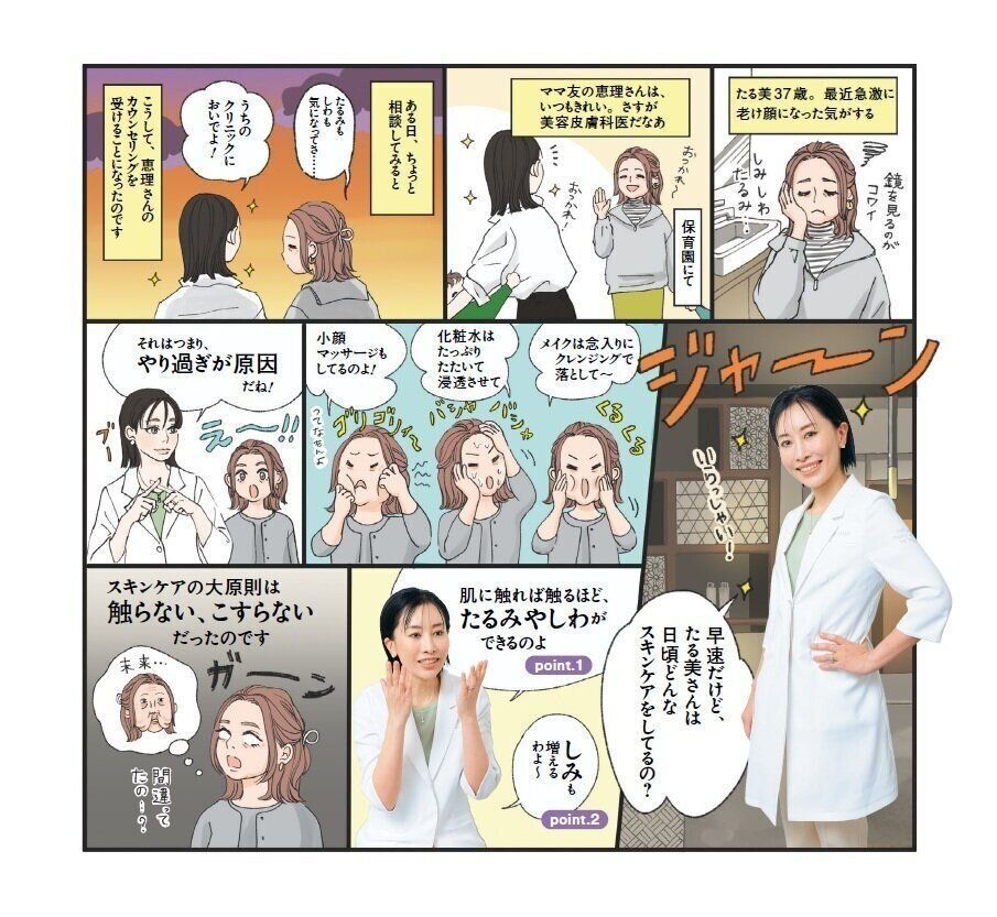 肌に触り過ぎて摩擦が加わると、表皮下の真皮で肌のハリを保っているコラーゲンやエラスチンが失われます。すると、皮膚がどんどん垂れ下がり、たるみやしわに。さらにマッサージなど肌を引き伸ばすような刺激が加われば、皮膚と骨をつなぐ靱帯(じんたい)もゆるみ、たるみが悪化するのです。
